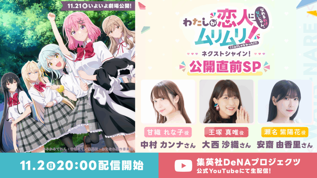 公開に先駆け、最新情報をお届けする公式生配信「『わたしが恋人になれるわけないじゃん、ムリムリ!(※ムリじゃなかった!?)~ネクストシャイン!~』公開直前SP」を 2025年11月2日(日)20:00から配信します!