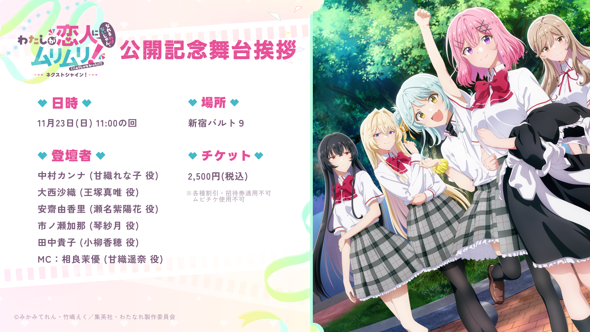 2025年11月23日(日)に新宿バルト9にて、『わたしが恋人になれるわけないじゃん、ムリムリ!(※ムリじゃなかった!?)〜ネクストシャイン!〜』の公開記念舞台挨拶を開催することが決定!当日は、本編上映後、メインキャスト陣が集結した舞台挨拶を実施予定です。