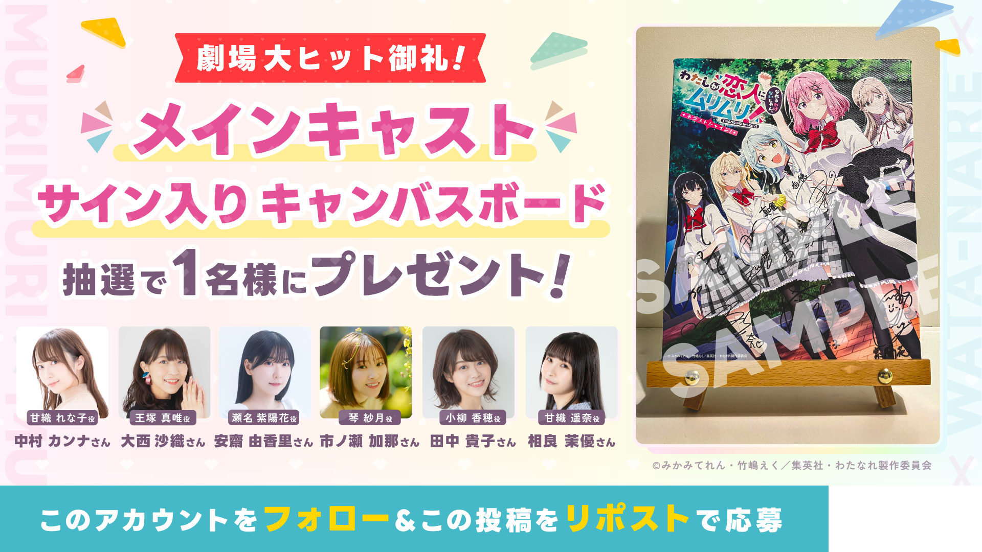 期間中、該当の投稿をリポスト、及び該当のXアカウントをフォローしてくれたユーザーの中から抽選で1名様に、本作のメインキャスト6名のサイン入り、『わたしが恋人になれるわけないじゃん、ムリムリ!(※ムリじゃなかった!?) 〜ネクストシャイン!〜』キービジュアルをあしらったキャンバスボード1枚をプレゼント!